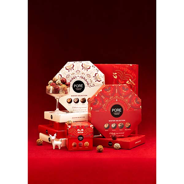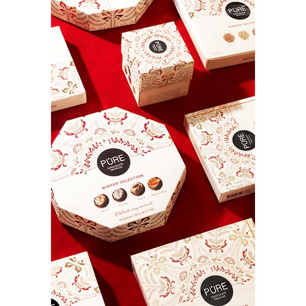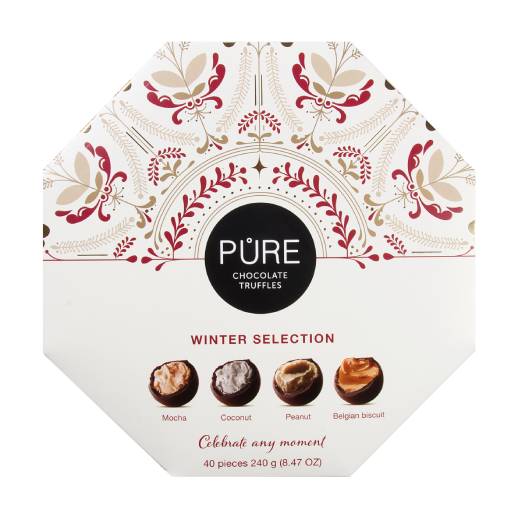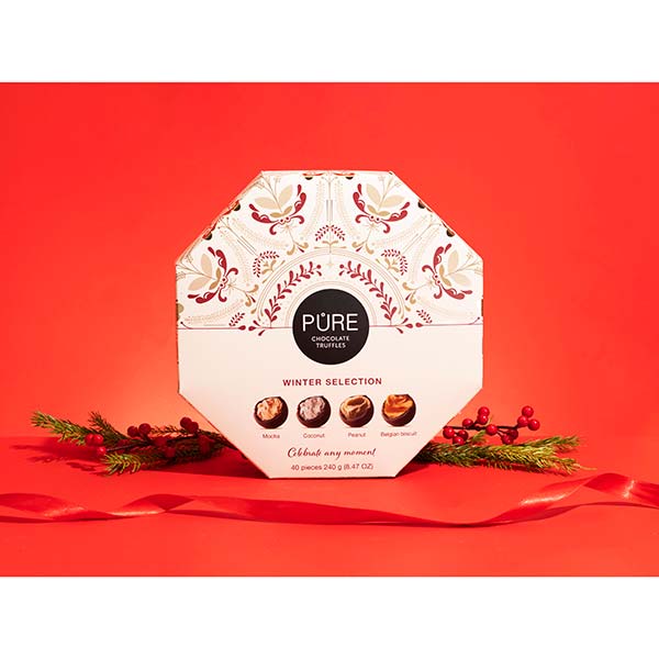 Un asortiment de trufe pentru intreaga zi: trufe cu cheesecake si zmeura pentru micul dejun, caramel pentru pranz, trufe cu coacaze pentru cina si, pentru un somn placut, trufe cu crema de turta dulce. O paleta bogata de arome, impachetata in aceasta cutie splendida, foarte potrivita pentru a fi oferita in dar, sau pur si simplu pentru a fi savurata in familie.