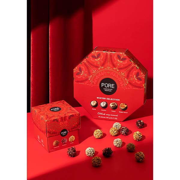 24 trufe delicioase cu caramel, turta dulce, cheesecake si coacaze negre, asortate intr-o cutie eleganta.
