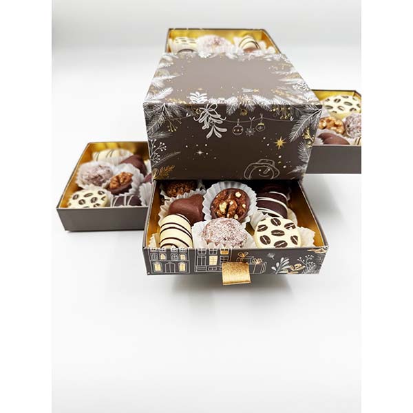 Cutie motive Craciun cu praline belgiene asortate Bruyerre 500g
