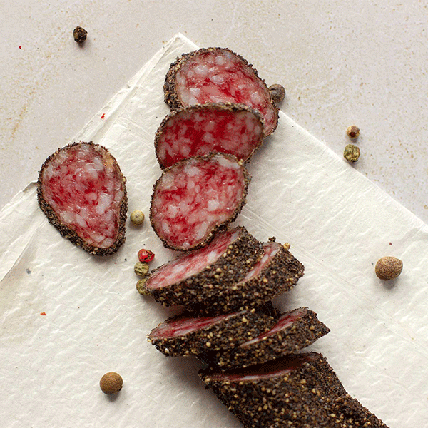 Fuetul acoperit cu piper negru este o varianta gustoasa si aromata a salamului uscat clasic, in care fuetul este acoperit cu boabe de piper negru intregi. Aceasta adaugare ofera o nota intensa de aroma si picanta, completand gustul sau bogat.