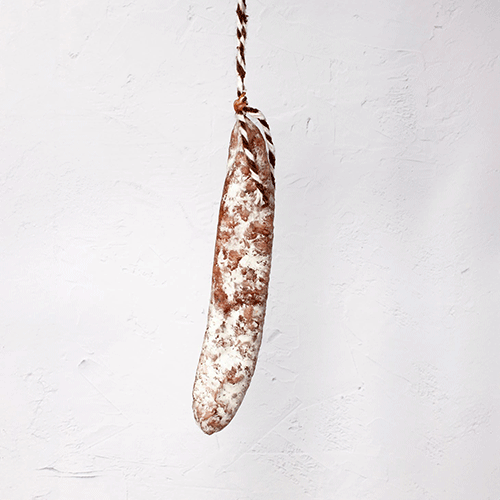 Fuetul cu trufa neagra este obtinut prin amestecarea carnii de porc cu bucati mici sau ulei de trufa neagra, care ii confera gustul caracteristic. Apoi, acest amestec este uscat si maturat in mod traditional, rezultand un produs final care imbina perfect textura moale a fuetului cu aroma patrunzatoare a trufei negre.