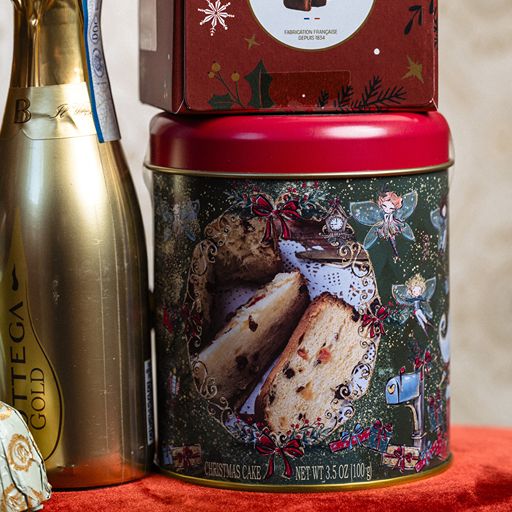 Un strop de bucurie în fiecare felie: mini panettone-ul Santa Claus îmbină aluatul pufos tradițional cu fructe confiate delicate și aromă fină de vanilie. Ambalat într-o cutie metalică festivă, devine cadoul ideal sau surpriza dulce perfectă pentru momente speciale de sărbătoare.