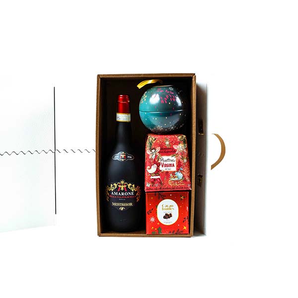Un cadou distins, construit în jurul celebrului Amarone della Valpolicella, completat cu panettone tradițional și dulciuri fine din ciocolată. Un gest de rafinament care va încânta și va lăsa o amintire memorabilă.