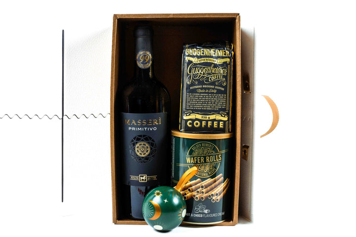 Un cadou care aduce zâmbete: o sticlă de vin roșu, arome de cafea, trufe fine și dulciuri crocante – tot ce îți trebuie pentru a simți căldura și magia Crăciunului.