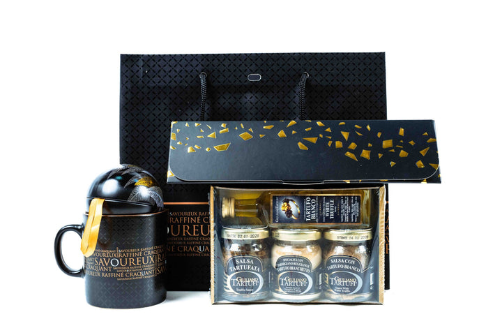 Un cadou simpatic și festiv, cu praline delicioase, trufe de ciocolată, specialități cu trufe Giuliano Tartufi și o cană ceramică Savoureux, toate pregătite într-o prezentare elegantă de sărbătoare.