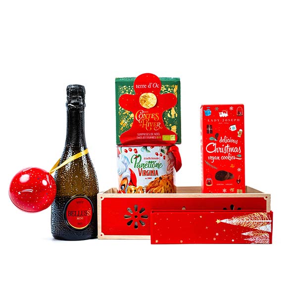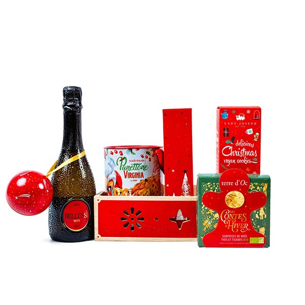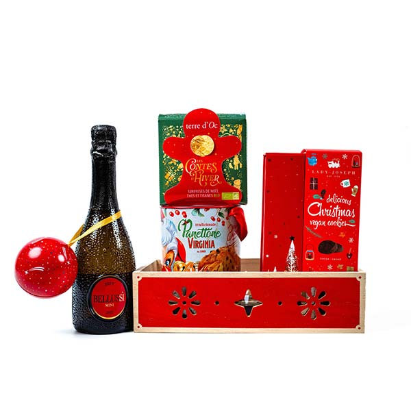 Un cadou festiv complet, cu spumant italian, panettone tradițional, trufe de ciocolată, fursecuri artizanale, ceaiuri organice și dulciuri de Crăciun, prezentate într-o tavită roșie elegantă din lemn.