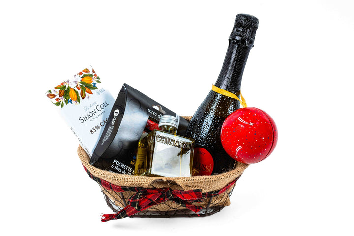 Un coș cadou rafinat, cu spumant italienesc, ciocolată intensă, ulei de măsline extravirgin, ceaiuri organice și trufe fine de ciocolată – un mix elegant de delicii gourmet pentru sărbători.