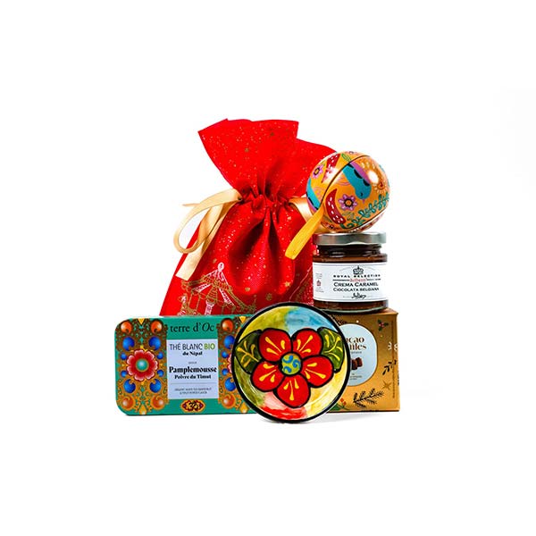 Un cadou drăguț și accesibil, cu arome dulci și surprize festive: ciocolată belgiană, trufe, ceai parfumat și o farfurioara din artizanală spaniola, toate într-un saculeț de Crăciun cu funda.