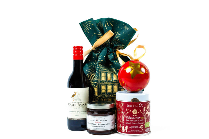 Un cadou rafinat de iarnă, cu vin roșu franțuzesc în format mini, mirodenii pentru vin fiert, gem delicat de căpșuni cu șampanie, trufe fine de ciocolată și un saculeț verde de Crăciun care adaugă farmecul sărbătorilor.